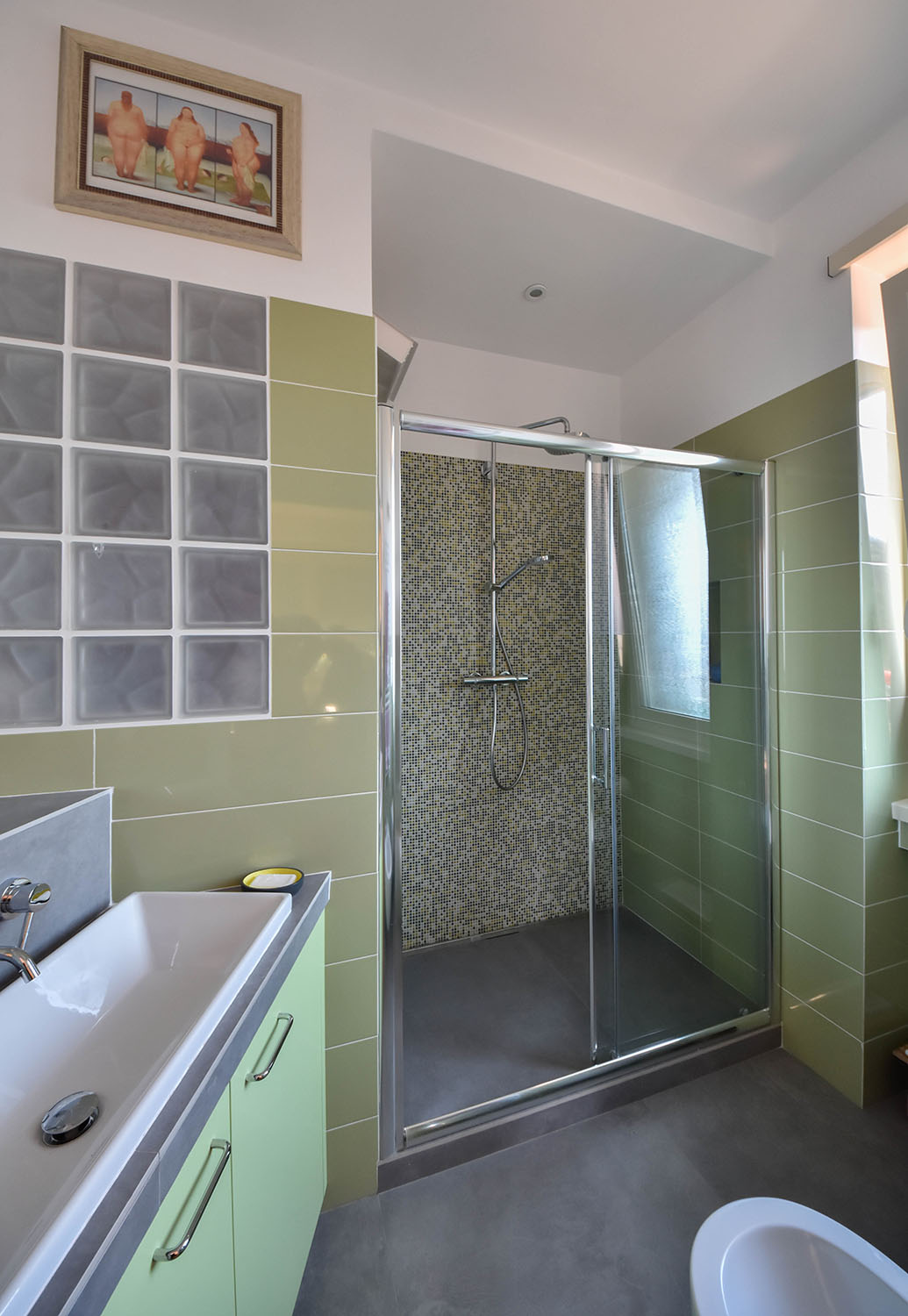 Il secondo bagno è di pertinenza esclusiva della camera da letto, ha un aspetto fresco e vitale nelle sue tonalità verde mela esaltate dal bellissimo mosaico ceramico di “Appiani “ presente nella grande doccia mentre il lavabo poggia su una struttura in muratura completata dal mobile laccato eseguito dalla “Artigiana Arredamenti “.