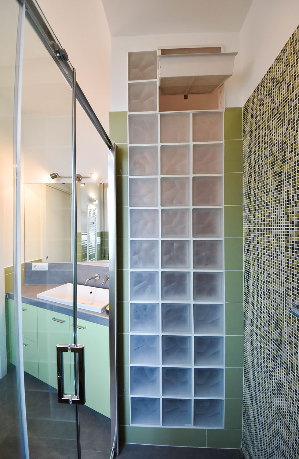Recuperando lo spazio del corridoio e dei vecchi armadi a muro abbiamo ottenuto un piccolissimo bagno per gli ospiti dove non manca la doccia luminosissima con le pareti in vetromattone. Le ceramiche “Bardelli” di colore rosso scuro esaltano le figure della sua collezione “Mad” mentre il piccolo lavabo della "Ceramiche Galassia “ poggia su una tavola di recupero.