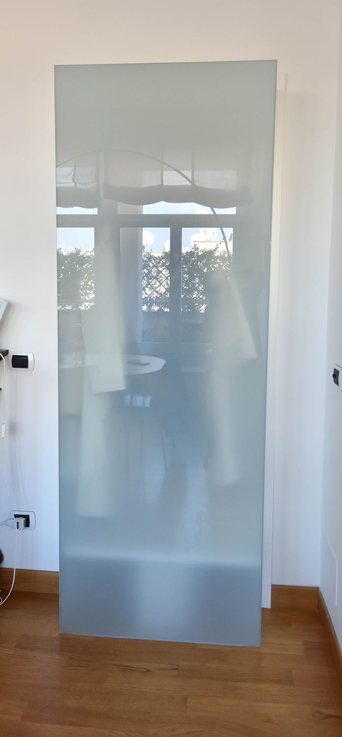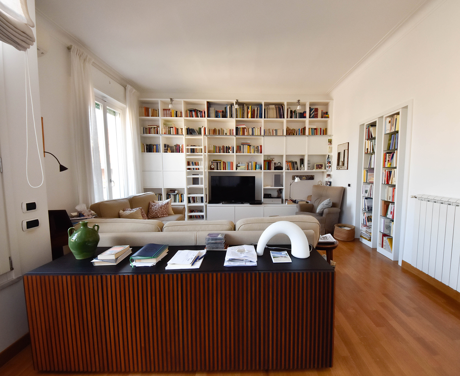 L'armadio di vetro satinato serve la zona ingresso quasi a voler essere un espositore, una vetrina. Le librerie, che all'occorrenza posso essere spostate, hanno una struttura in legno laccato ed il fondo in vetro che garantisce il passaggio della luce. Un gioco di trasparenze dove le sagome degli abiti e dei libri sono presenze intangibili ,ma luminose.