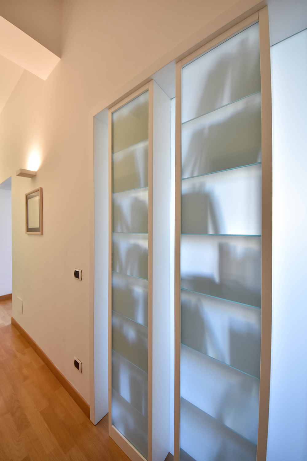 Grande protagonista di questo intervento è il vetro e questa volta usato per contenere un armadio e una libreria. Entrambi sono stati collocati in due passaggi che vanno dalla zona soggiorno al corridoio garantendo a quest'ultimo la luminosità naturale.