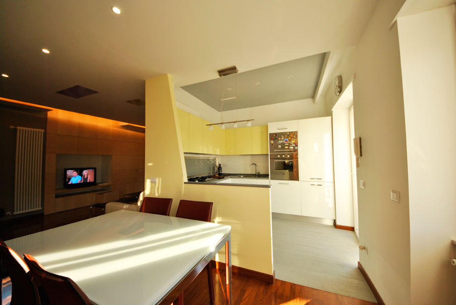 Infatti la cucina diventa "quadrata" ed il soggiorno si dilata nel vecchio corridoio, di cui rimane traccia solo in un "taglio ideale" nel controsoffitto. Ottenuto un ambiente giorno più ampio, si è potuta distinguere la zona pranzo dalla zona salotto, mentre la camera da letto padronale ha trovato una sua espansione nel grande ingresso attrezzato con armadiature. Il taglio nel controsoffitto riportato sulle grandi ante scorrevoli, ci conduce nella seconda camera da letto, ridotta nelle dimensioni per dar luogo ad un ambiente di servizio.