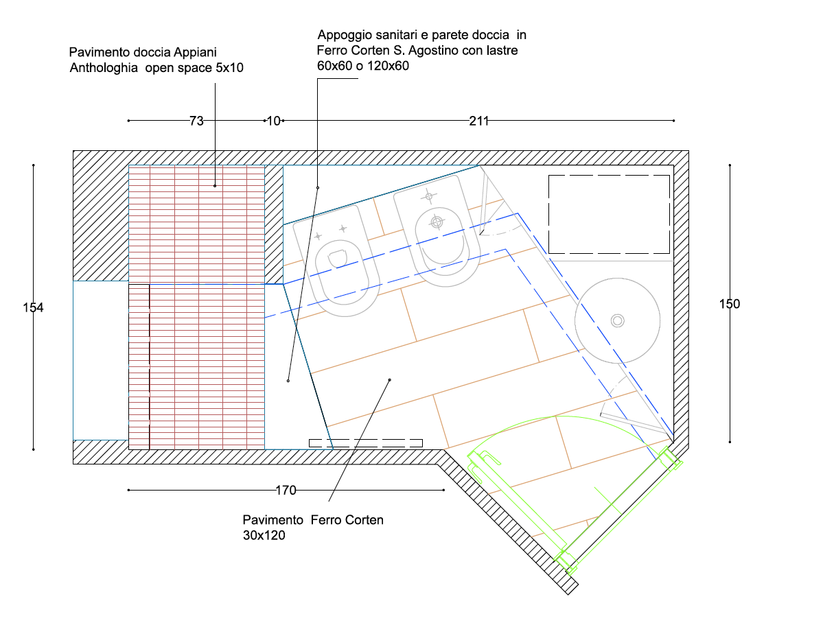 Ceramiche Azulej di Mutina per le pareti - Ferro corten - Sant'agostino per i pavimenti - mosaico antologhia di Appiani per il pavimento della doccia – Sanitari Galassia - Stucco Spatula Stuhhi colori del sole -
