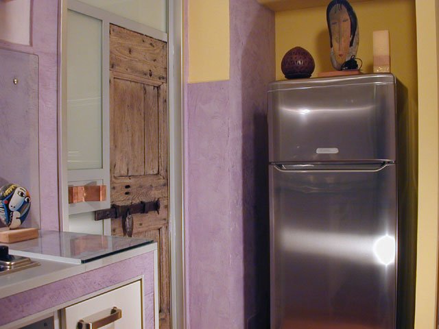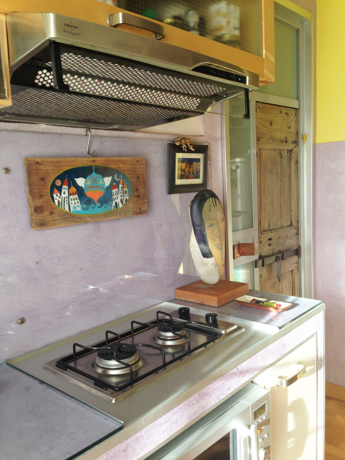 recuperata e restaurata dal proprietario. Nella piccola cucina, il vecchio lavabo in graniglia e rame, recuperato nella cantina della casa paterna, è semplicemente poggiato su di un piano in muratura trattato ad encausto, così come le pareti -stucco a colore in diversi strati e polvere di marmo-.